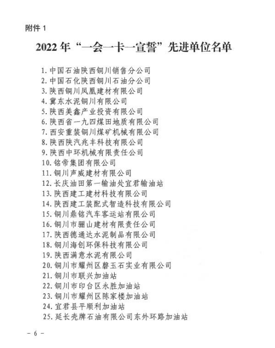 根据铜安委办发〔2023〕3 号文件通报,陕建装配智造公司荣获铜川市 2022 年度“一会一卡一宣誓”先进单位表彰。