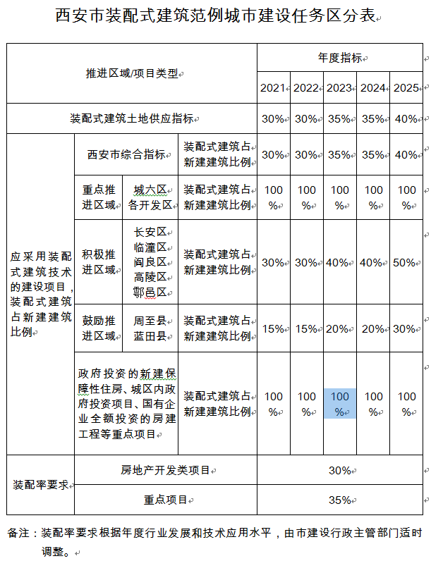 长安区、临潼区、阎良区、高陵区、鄠邑区等积极推进区域内民用建筑项目,应采用装配式建筑技术的,装配式建筑占新建建筑比例2021—2022年不低于30%、2023—2024年不低于40%、2025年不低于50%。