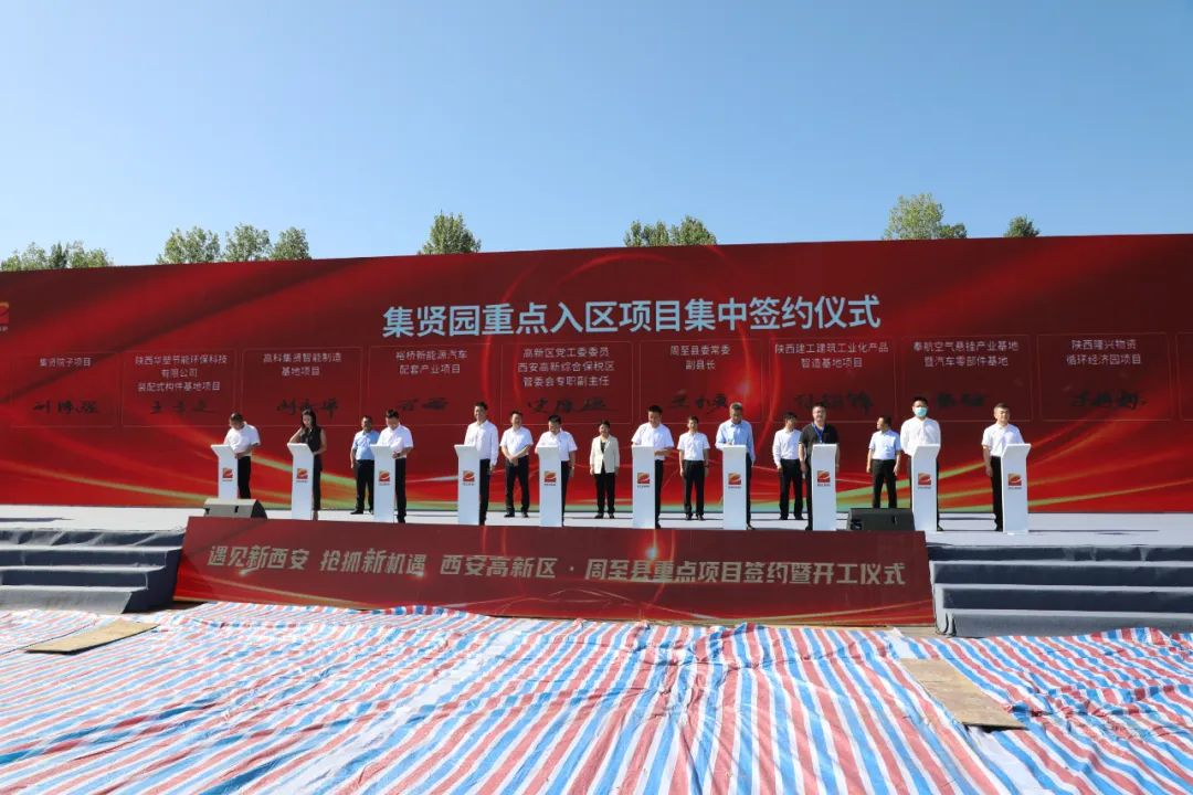7月28日,西安高新区·周至县重点项目签约及开工仪式在集贤园举行。陕西建工建筑工业化产品智造基地项目将落户西安集贤产业园。西安市委常委、高新区党工委书记马鲜萍宣布开工。陕建控股集团党委副书记、副总经理刘小强,副总经理黄永根,西安高新区管委会主任齐海兵等领导出席签约及开工仪式。