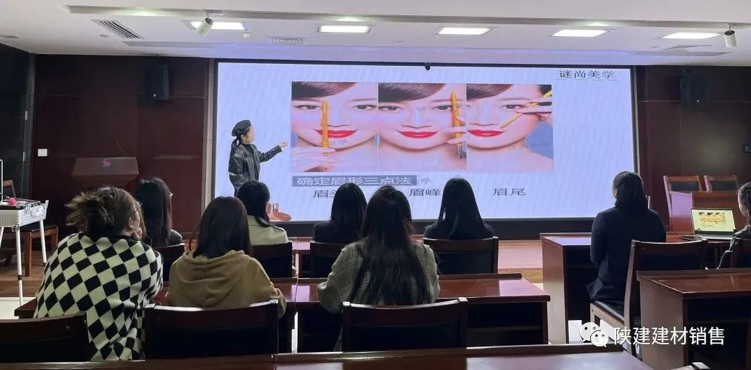 随后,开展了彩妆课堂讲座活动,活动中老师从脸型、眉形分析及不同脸型的眉毛、腮红选择等基本妆容知识开始讲解,并结合学员外貌特点分析,使大家对适合自身的妆容有基本了解;接着选出几名学员进行实践操作,示范日常妆容的化妆流程,学员们针对化妆中的各个步骤踊跃提问,将活动推向高潮;最后,学员们在老师的指导下亲自动手对镜描眉画妆。
