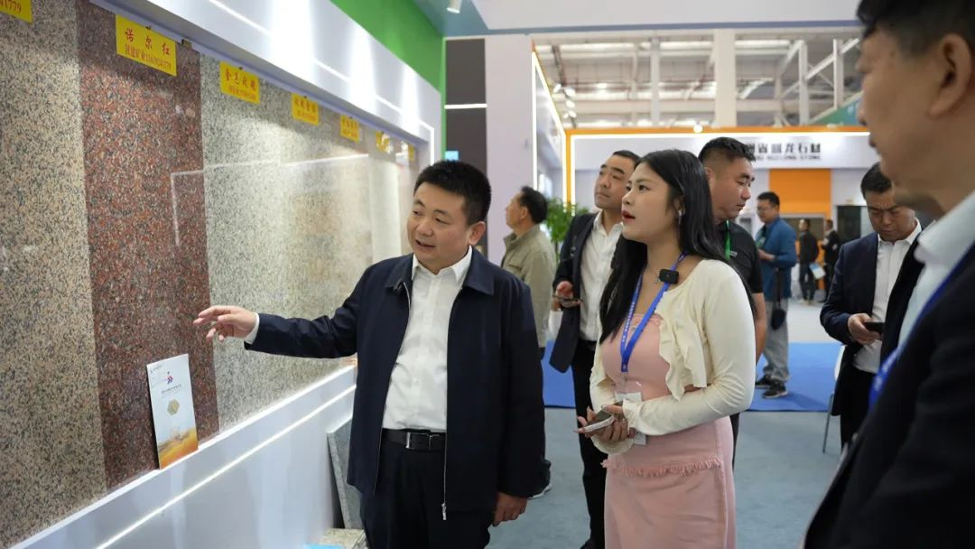 博览会上,付超锋一行与国内石材行业头部企业进行了深入交流,参观了解了各参展企业的产业规模、产品布局等情况,交流了石材生产应用成果。在受邀参展的内蒙古陕建矿业公司展位前,他仔细了解参展及销售情况,并通过线上直播间宣传推广企业产品。