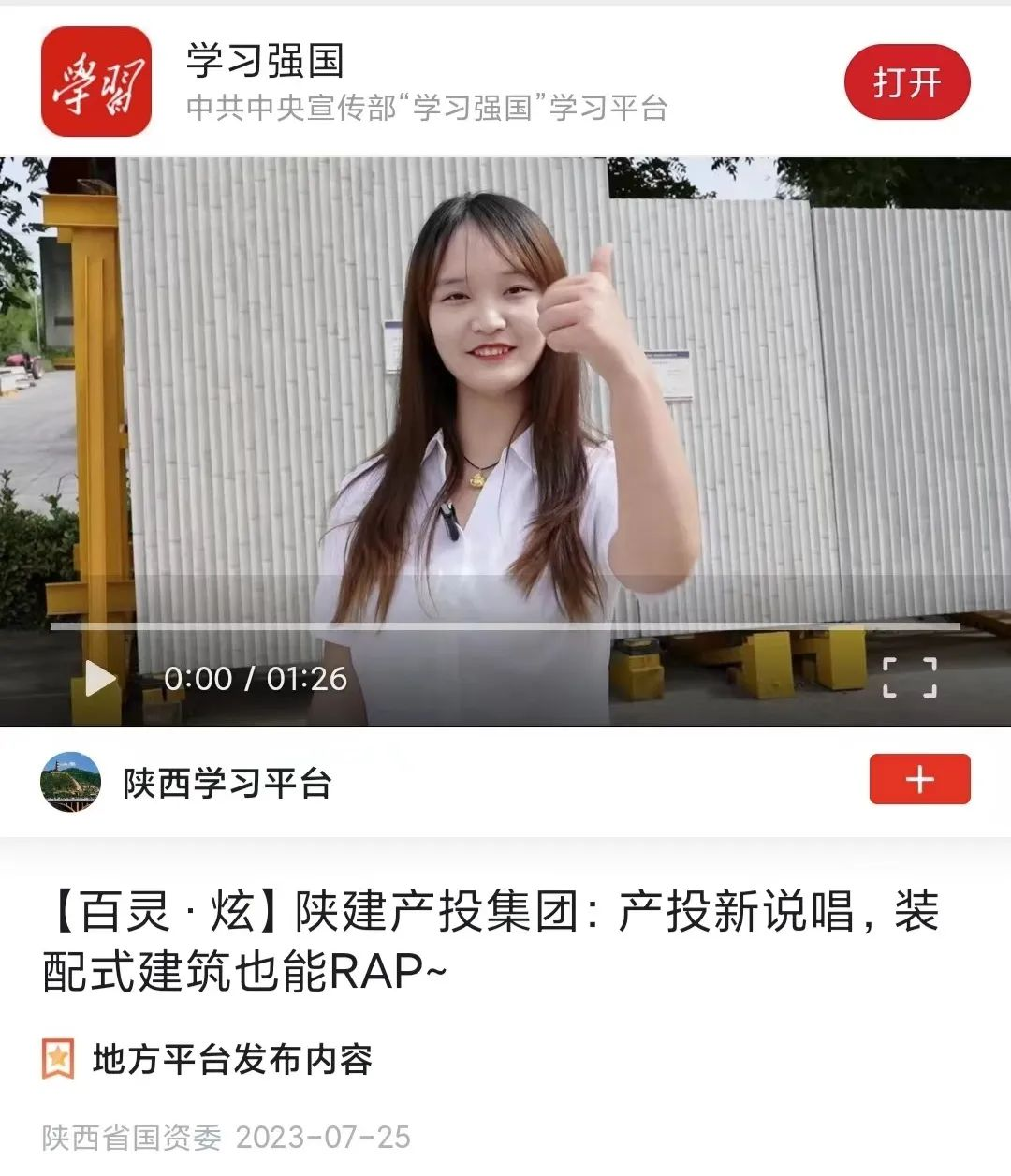 该作品用说唱的全新表现形式,展现了集团建筑全产业链的产业布局,通过快节奏的音乐律动介绍了产品特色,彰显了集团富有激情、勇于创新的员工风采。该作品发布之后,获得了良好的传播效果,被陕西省国资委转载至《学习强国》平台。
