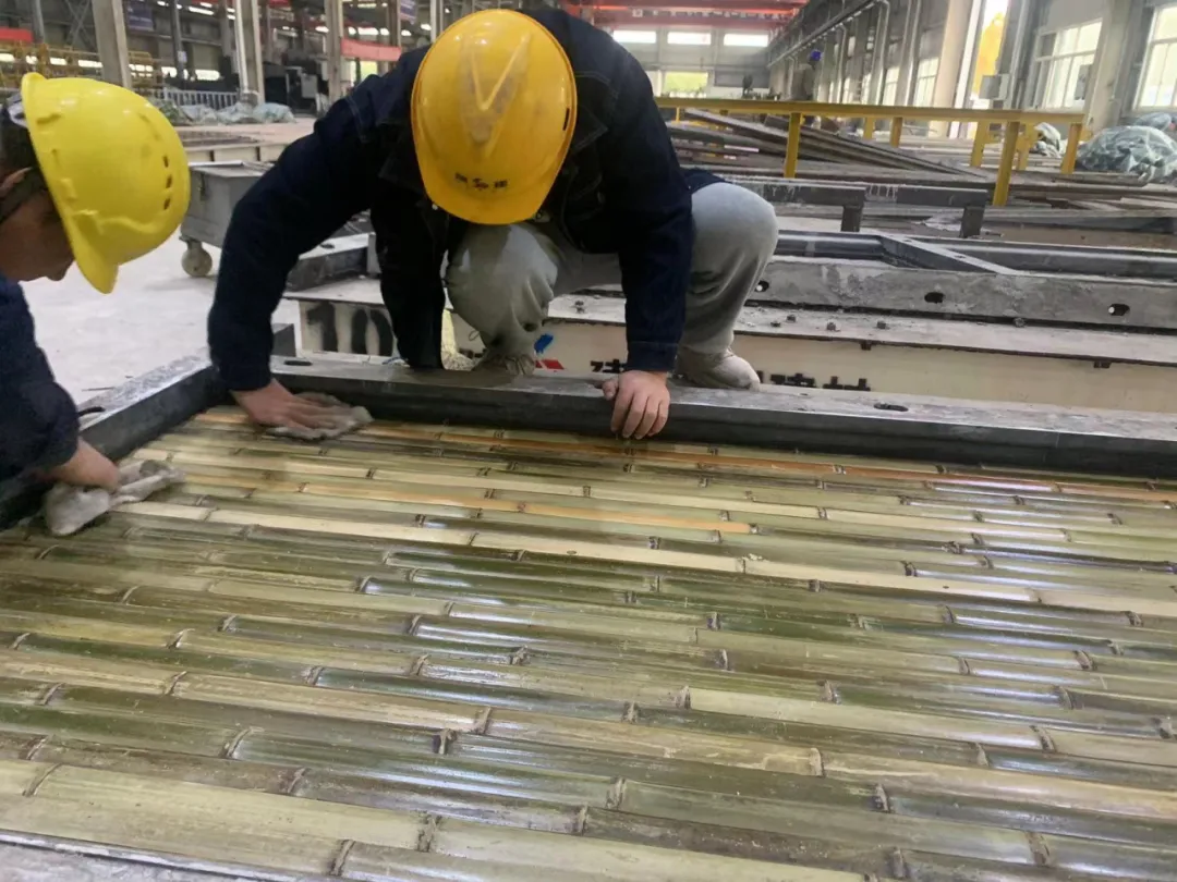 在此次QC活动中,小组成员运用科学的测算和调查方法,逐一分析竹纹挂板一次合格率,针对“粘模、掉角”这两项症结,经过运用BIM技术改进翻转工装,多次试验脱膜剂材料等一系列改进措施,将成品一次平均合格率由94.72%提升至99.38%。随后小组成员将活动中的有效对策进行整理、归档,汇总编制形成《预制竹纹挂板生产作业指导书》全面运用到生产实践中,全面提高竹纹挂板一次合格率。