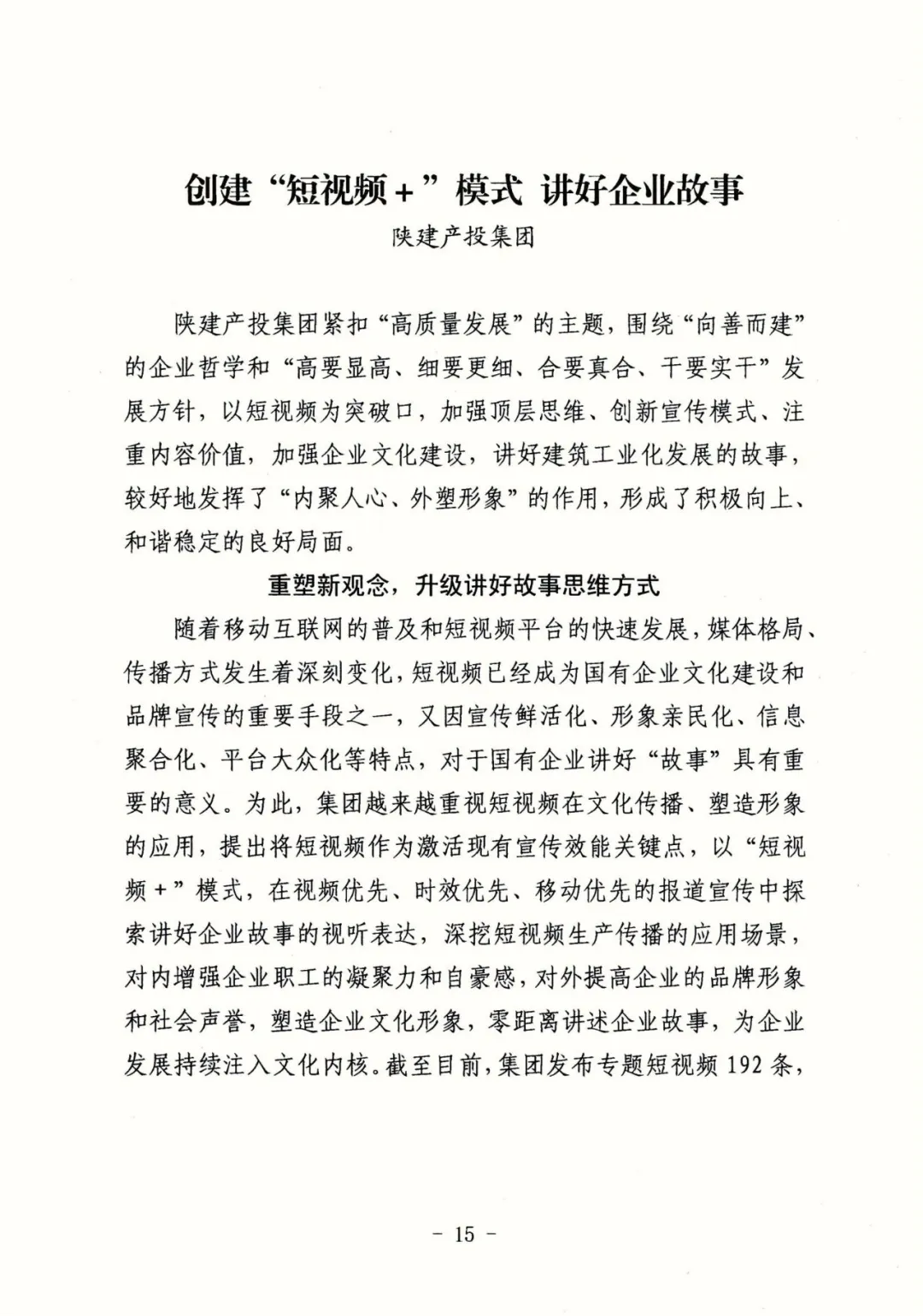 近日,陕西省国资委印发的第5期“企业文化建设专项提升行动工作简报”,对陕建产投集团企业文化建设工作中运用“短视频+”模式进行了重点经验分享,让我们一起看看吧!