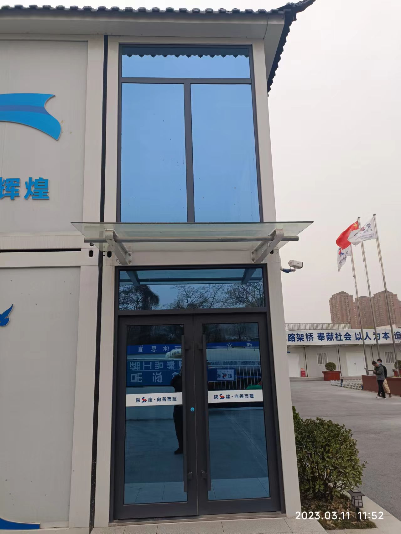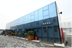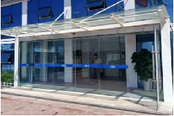 福特蓝钢化玻璃、彩铝骨架自动回弹+闭门器